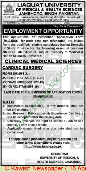 Applications are invited from qualified/ eligible candidates having domicile of Sindh Province for the following positions on regularbasis at Liaquat University of Medical and Health Sciences, LUMHS Jamshoro: