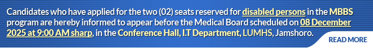 All the students of Liaquat University of Medical & Health Sciences, Jamshoro, are hereby informed to submit their application forms along with the required documents for Zakat Need Cum Merit Scholarship 2025-26 latest by 30th October 2025, in the Students Financial Aid Office (SFAO) during working hours.